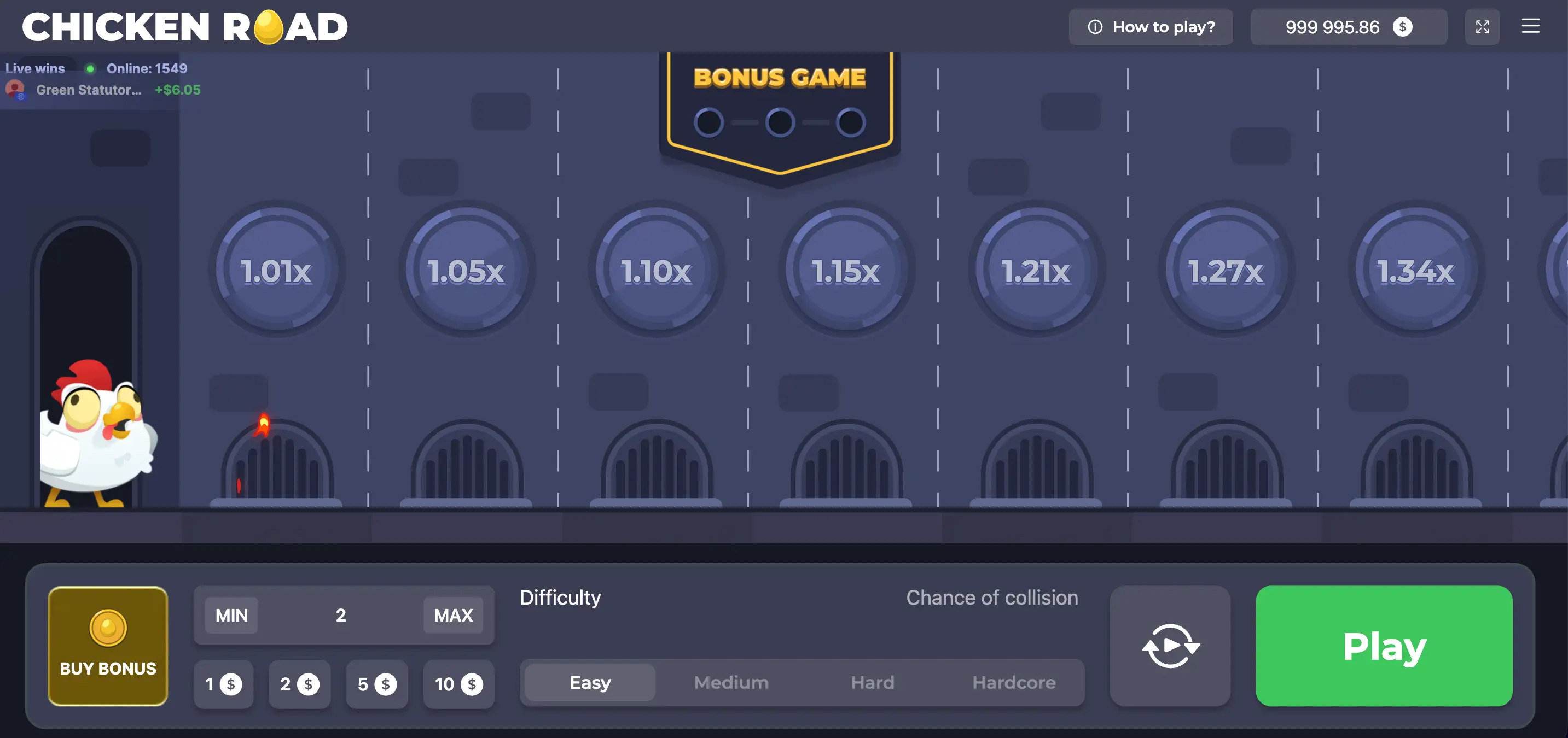 Select your bet amount (typically $0.01 to $200) and choose one of four difficulty levels: Easy, Medium, Hard, or Hardcore. Each level changes the number of tiles, starting multiplier, and overall volatility.